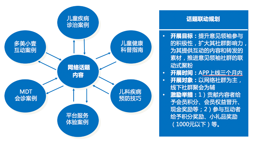 第二步:聚合集粉。通過“網絡話題互動”活動提升意見領袖的參與度,以大量的兒科醫學內容、兒童疾病診治案例、兒童健康科普指南、兒科疾病預防技巧、平臺服務體驗案例等強化患者聯動,并以老帶新,實現患者快速集聚。