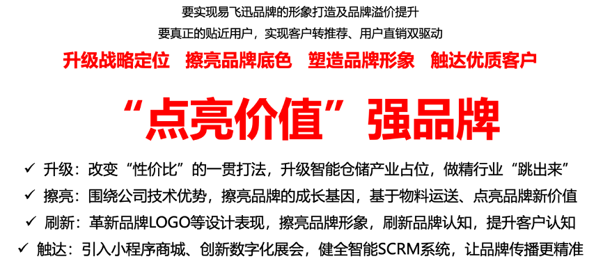 厘定公司的品牌核心價(jià)值,明晰新的品牌定位,刷新強(qiáng)品牌形象,搭建以智能SCRM系統(tǒng)等主導(dǎo)的數(shù)字化品牌傳播系統(tǒng),創(chuàng)新品牌推廣,才能打造工業(yè)品領(lǐng)先品牌,助力易飛迅迅猛增長(zhǎng)。