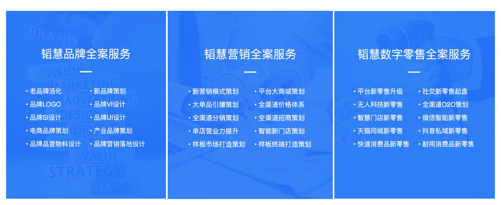 “年度全案服務”主要包括三大全案服務,分別是品牌全案服務、營銷全案服務和數字零售全案服務,年度合作,年度制全案策劃,與企業親密合作,共同推動企業“價值化成長”,品牌業績雙豐收。
