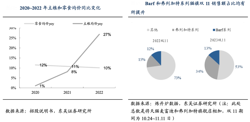 經(jīng)典案例:根據(jù)招股說明書、煉丹爐數(shù)據(jù)、、東吳證券研究所等綜合資訊表明,乖寶寵物隨著成分配方優(yōu)化和新產(chǎn)品線的推出均價(jià)趨于提升,產(chǎn)品均價(jià)趨于提升,2020-2022 年,公司主糧/零食/保健品及其他的 均價(jià)分別提升了 37%/22%/52%。其中,麥富迪的高端系列“Barf 系列”和高端貓糧“弗 列加特系列”均表現(xiàn)突出。