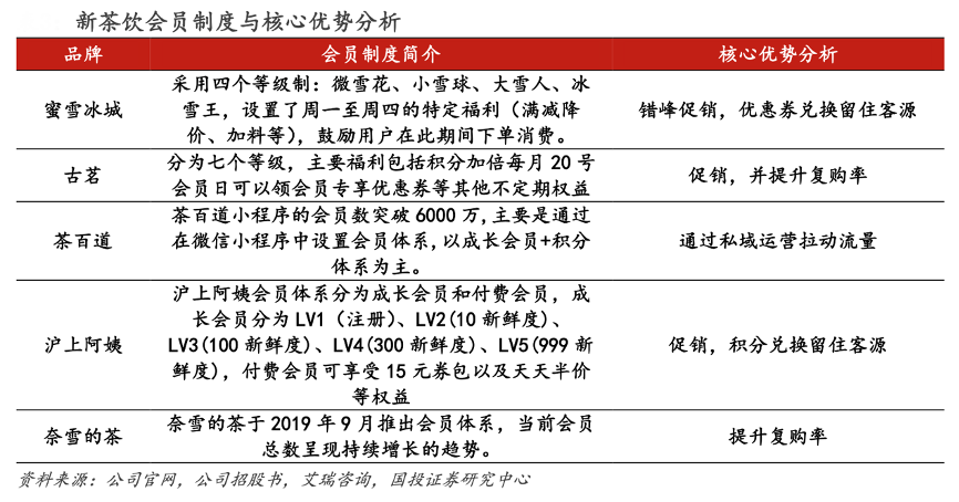 經(jīng)典案例:根據(jù)公司官網(wǎng)、公司招股書(shū)、艾瑞咨詢(xún)、國(guó)投證券研究中心等綜合資訊表明,五家茶飲企業(yè)均采用會(huì)員制的方式進(jìn)行客戶(hù)留存,以提升新客轉(zhuǎn)化率。會(huì)員制的核心目在于,通過(guò)積分的方式推進(jìn)復(fù)購(gòu)率的提升,推動(dòng)老客群體的多次消費(fèi);同時(shí)以會(huì)員制形成一個(gè)較好的渠道,從而使得新茶飲企業(yè)利用新媒體進(jìn)行更多的私域流量引流。